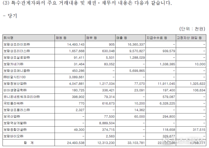 특수관계자와의 자금거래는 보람상조라이프(주)에 33억원 대여, 보람역삼개발(주)로부터 46억310만원 차입 등이 있었다.