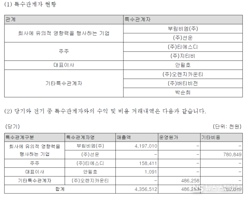 특수관계자와의 자금거래에서는 대표이사와 주주, 계열사 등에 대한 단기대여금이 128억1801만원, 미수금이 8억569만원, 미지급금이 1억9834만원으로 나타났다. 특히 단기대여금 128억원 중 (주)티에스디 단기대여금에 대해서는 40억원의 대손충당금을 설정하고 있어, 계열사 및 특수관계자 자금 회수 불확실성이 크다. 이는 회사의 자금 경색을 심화시킬 수 있는 잠재적 위험 요인이다.