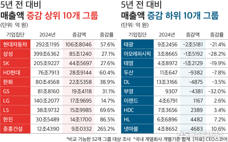 특히 조사대상 그룹 중 현대차그룹이 유일하게 5년 동안 매출액이 100조원 이상(106조8046억원) 증가했다. 2위는 85조1240억원 증가한 삼성이며, 3위 SK(44조5697억원↑), 4위 HD현대(28조9144억원↑), 5위 한화(22조5358억원↑) 등의 순이었다.
