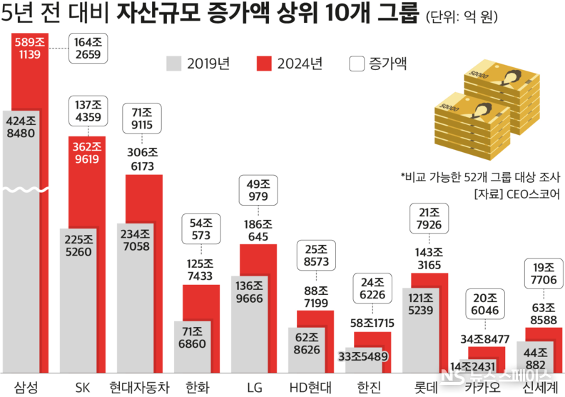 삼성그룹은 5년 새 자산규모가 164조원 늘어나 단일 그룹으로 최대 증가폭을 기록했다. 삼성의 총자산은 2019년말 424조8480억원에서 지난해 말 589조1139억원으로 38.7% 증가했다.
