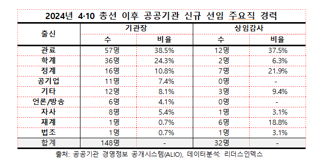 기관장 295명의 출신 배경을 살펴보면 관료가 100명(33.9%)으로 3분의 1 이상을 차지했고, 이어 학계 71명(24.1%), 정계 35명(11.9%) 순이었다. 이에 비해 자사 출신은 31명(10.5%), 공기업 출신은 14명(4.7%)에 불과했다. 내부 승진보다 외부 낙하산 인사가 압도적으로 많았다는 사실을 방증한다. 상임감사 인사에서도 특정 분야 편중 현상이 짙었다. 91명 중 관료 40명(44.0%), 정계 13명(14.3%)로 절반 이상을 차지했다.