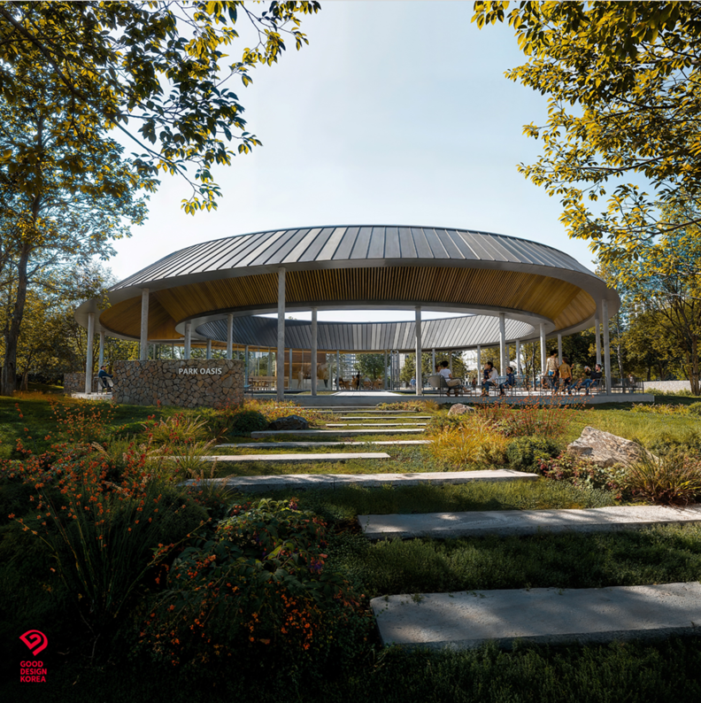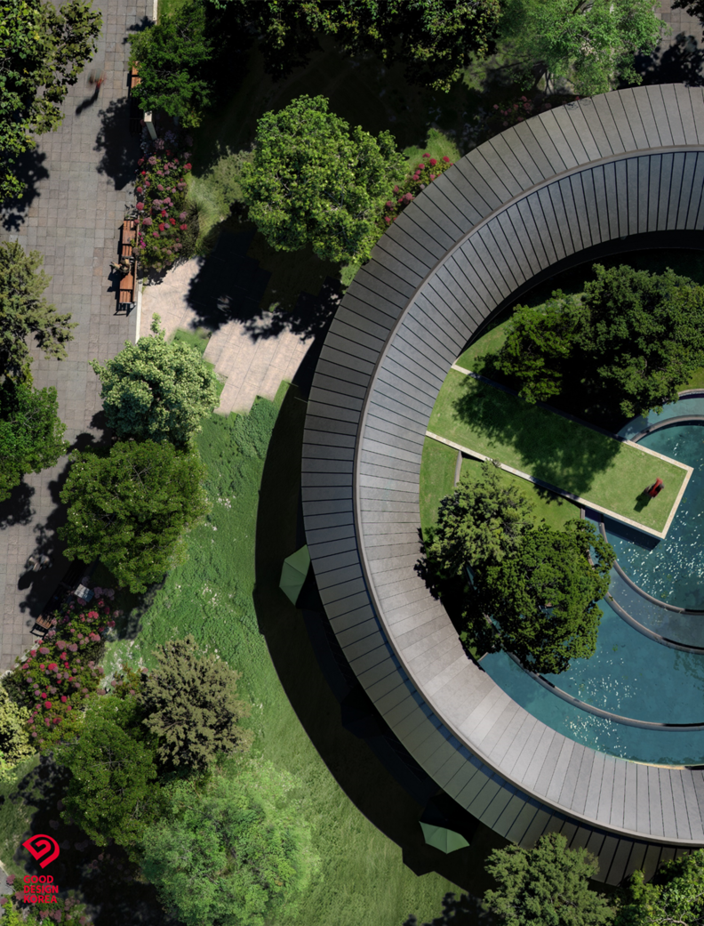 디자인의 출발점은 순환과 중심(Circle & Connection)이다. 원형의 평면 구조는 이용자의 동선과 시선을 부드럽게 이어주며, 중앙의 수공간은 공간의 시각적이자 정서적 중심축 역할을 한다. 물 위로 떨어지는 빛의 결, 바람의 움직임, 식재의 그림자가 어우러져 이용자에게 명상적 경험을 선사한다. 이를 통해 도시 속에서도 자연의 시간성과 감성을 체감할 수 있는 건축적 장치를 구현했다.