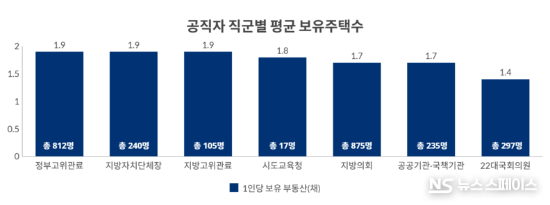 직군별 1인당 보유 주택 수를 보면 정부 고위관료가 1.89채로 가장 많았다. 이어 지자체장이 1.87채, 지방의회와 공공기관·국책연구기관 공직자는 각각 1.71채 수준이었다. 국회의원은 평균 1.41채였으며, 정당별로는 국민의힘 의원이 1.68채, 더불어민주당 1.33채, 조국혁신당 0.67채, 개혁신당·무소속·진보당 등 소수정당 및 무소속 의원은 평균 0.8채로 나타났다.