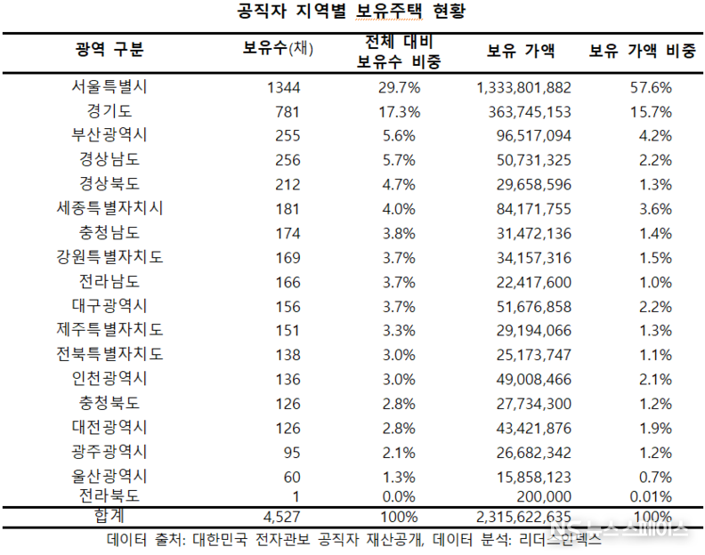 서울에 이어 경기도 781채(17.3%), 경상남도 256채(5.7%), 부산 255채(5.6%), 경상북도 212채(4.7%), 세종 181채(4.0%) 순이었다. 서울·경기 합산은 47%이고 인천(136채, 3.0%)까지 포함하면 수도권 소재 주택 비중이 정확히 50%였다.