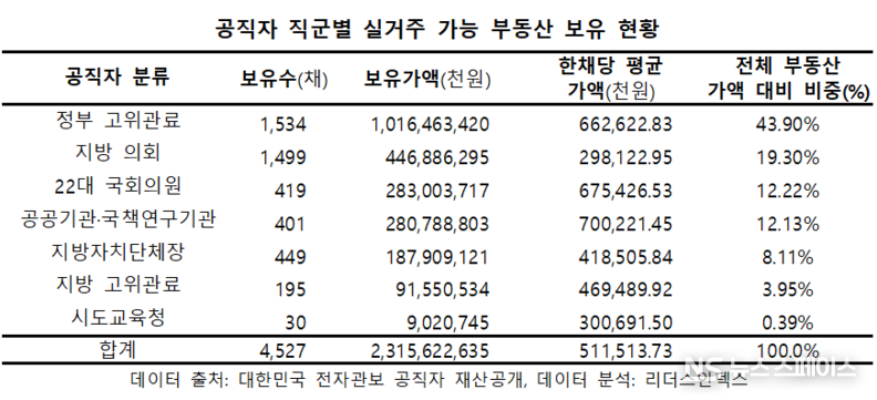 11월 18일 리더스인덱스(대표 박주근)가 국회의원을 비롯해 고위 관료 등 공무원(4급 이상) 2581명의 가족 재산공개 내역(최신 업데이트 기준)을 분석한 결과, 이들의 건물 자산은 총 3조3556억원으로 전체 재산(5조7134억원)의 58.7%를 차지했다. 이 중 실거주 가능 주거용 부동산은 4527채, 가액으로는 2조3156억원이었다.