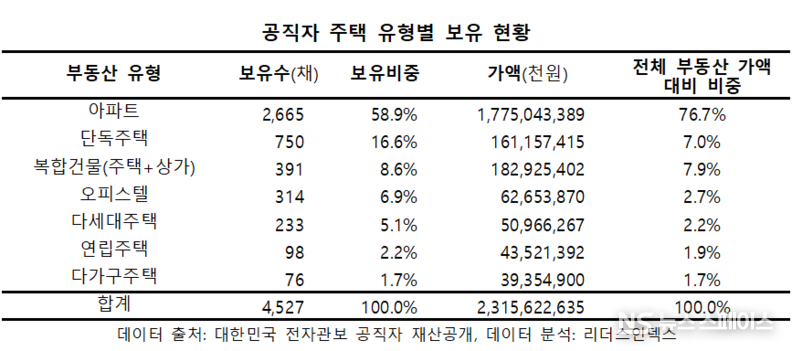 주택 유형별로는 아파트 비중이 단연 컸다. 전체 4527채 중 아파트는 2665채(58.9%)로 절반을 훌쩍 넘겼으며, 가액은 1조7750억원(76.7%)에 달했다. 이어 단독주택(16.6%), 복합건물(8.6%), 오피스텔(6.9%), 다세대·연립·다가구주택(합계 9.0%) 순이었다.