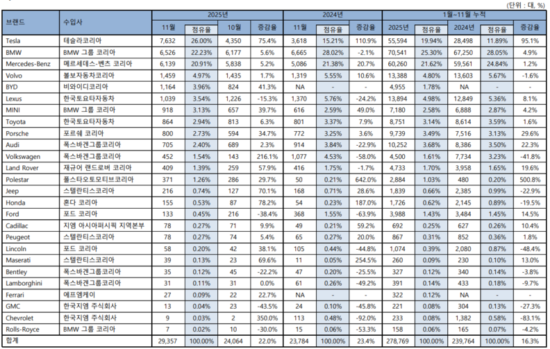 테슬라는 7,632대로 1위를 기록하며 10월 일시 후퇴 후 한 달 만에 선두를 되찾았다. 이어 BMW 6,526대, 메르세데스-벤츠 6,139대, 볼보 1,459대, BYD 1,164대, 렉서스 1,039대, 미니 918대, 도요타 864대, 포르쉐 800대, 아우디 705대가 2~10위를 형성했다.