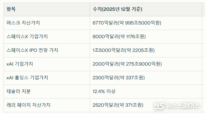 미 경제지 포브스는 2025년 12월 15일(현지시간) 머스크의 자산가치가 스페이스X의 기업가치 급등을 반영해 종전보다 1680억달러(약 247조원) 급증했다고 밝혔다.