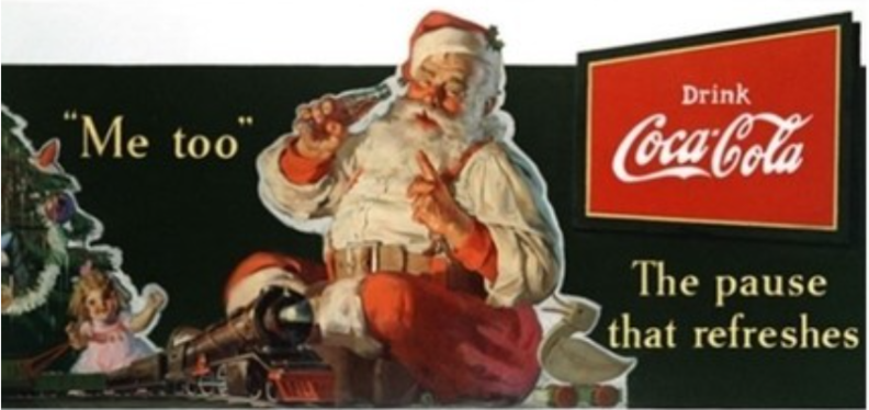 다만 시각적 아이콘으로서의 현대적 산타를 결정적으로 굳힌 것은 1931년 코카콜라가 광고 일러스트레이터 해든 선드블롬(Haddon Sundblom)에게 의뢰한 캠페인이었다. 코카콜라는 당시 “코카콜라는 여름 음료”라는 인식을 깨고 겨울에도 상쾌하게 마실 수 있는 음료라는 메시지를 전달하기 위해, 자사 브랜드 컬러(빨간색·흰색)에 맞는 푸근하고 현실적인 산타 이미지를 만들었고, 선드블롬이 1931~1964년까지 그린 일련의 산타 그림은 잡지·빌보드·포스터·달력·점포 디스플레이를 통해 전 세계에 확산되며 오늘날 ‘빨간 산타’의 표준을 사실상 완성했다.