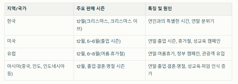 차이를 알아보면, 국내에서는 연말(12월)이 콘돔 판매의 절정으로, 크리스마스와 크리스마스 이브가 가장 높은 판매량을 기록한 반면 해외의 콘돔 판매 시즌성은 문화적·사회적 차이에 따라 뚜렷한 특징을 보인다.