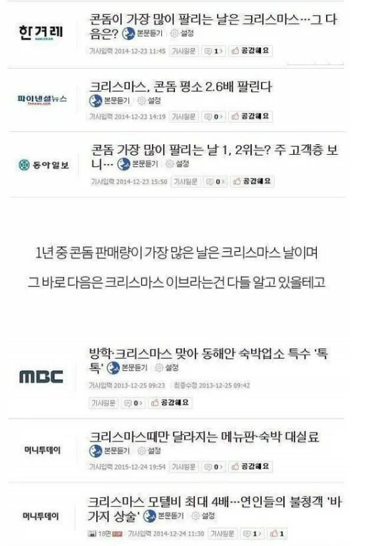 한국의 대표 편의점인 세븐일레븐, CU, GS25와 주요 시장조사기관(Kaggle, Powerdrill AI, Custom Market Insights)과 미디어 연구기관(fortunebusinessinsights)의 조사 결과에 따르면, 크리스마스 당일 콘돔 판매량은 평소보다 2.5배 이상 급증하며 연중 최고치를 기록했다.