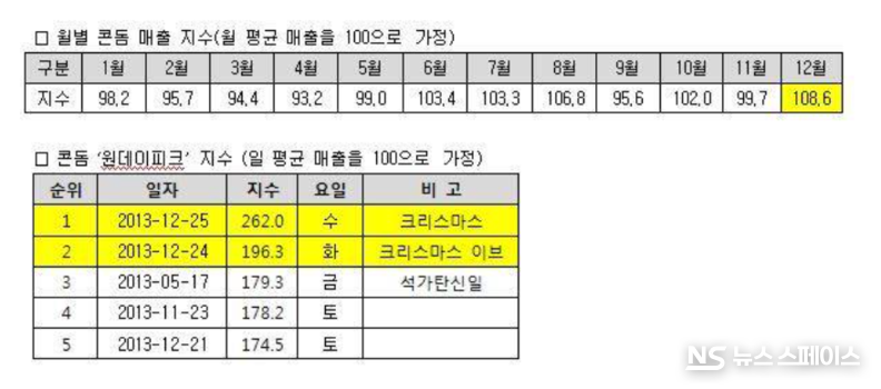 편의점 세븐일레븐의 월별 콘돔 매출 분석에 따르면, 12월이 연중 가장 높은 판매량을 기록한다. 12월 평균 매출 지수는 108.6으로, 여름 휴가철인 8월(106.8)보다도 높았다.