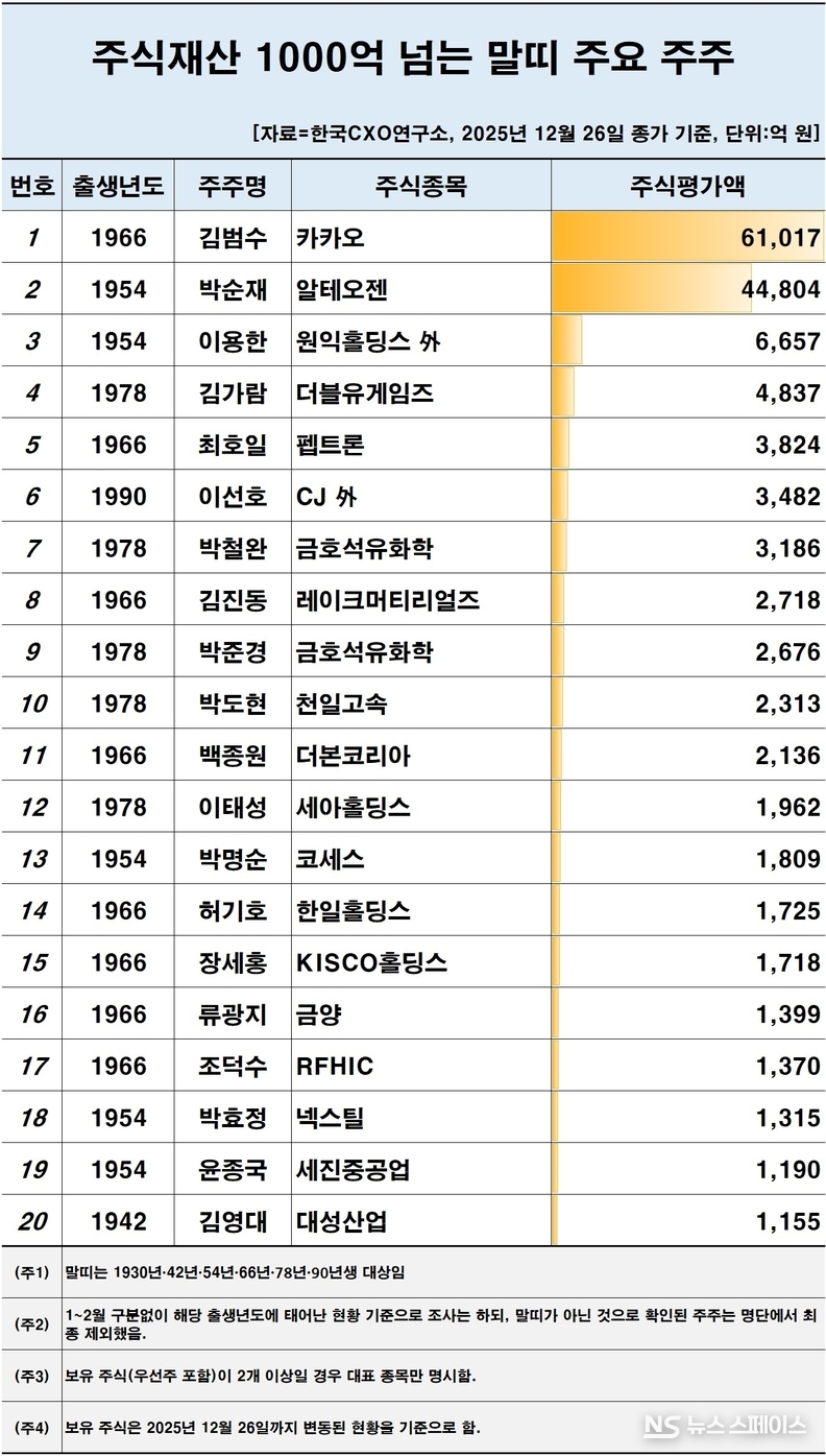 한국의 기업인·경영인에는 주식 재산이 1조원이 넘는 주주는 김범수 카카오 창업자(6조1017억원)와 박순재 알테오젠 회장(4조4804억원) 2명이다. 김범수 창업자는 1966년생, 박순재 회장은 1954년생 말띠에 해당한다. 1000억원 이상 주식 평가액을 보유한 말띠 주주도 20명에 육박했다.