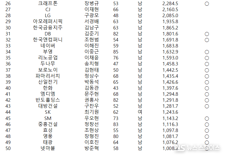 IT·게임·엔터 업종에서도 김범수 카카오 센터장(10위), 방시혁 하이브 이사회 의장(12위), 장병규 크래프톤 이사회 의장(26위), 이해진 네이버 의장(33위), 방준혁 넷마블 이사회 의장(50위) 등 5명이 이름을 올렸다.