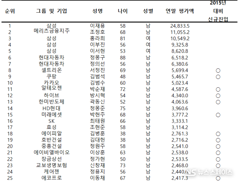 이번 조사는 부호들이 보유한 상장·비상장 주식을 모두 평가한 것으로, 상장주식은 평가일 기준 주가를 반영했고, 비상장 주식은 직전 연도 결산 기준 순자산가치의 보유지분율로 평가했다.