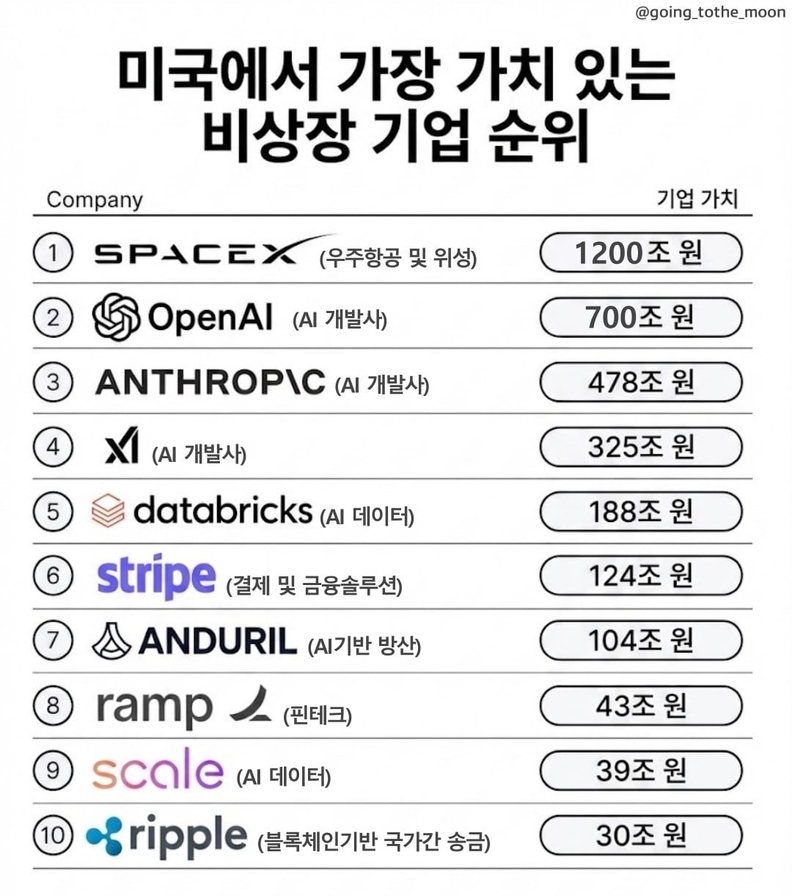 2위는 오픈AI(700조원), 3위는 앤트로픽(478조원), 4위는 xAI(325조원)가 이었고, 5위 데이터브릭스Databricks(188조원), 6위 스트라이프Stripe(124조원), 7위 안두릴Anduril(104조원), 8위 랩프Ramp(43조원), 9위 스케일Scale(39조원), 10위 리플Ripple(30조원) 순으로 랭킹됐다.