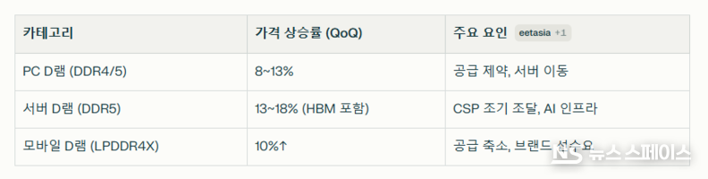 2025년 4분기 범용 D램 고정거래가격은 전분기 대비 45~50% 상승하며 삼성의 D램 점유율 회복을 견인했다. 트렌드포스는 서버 DDR5 수요 강세와 HBM 우선 생산으로 PC·모바일 D램 공급이 부족해지면서 4분기 전체 D램 가격이 13~18% 오를 것으로 분석했으나, 실제 서버 중심 호조가 이를 상회했다.