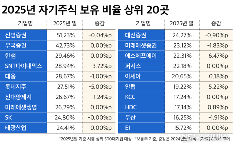 자사주 보유 비율(보통주 기준)은 신영증권이 가장 높았다. 지난해 신영증권의 자사주 보유 비율은 전체 발행주식의 51.23%에 달해 조사 대상 기업 중 유일하게 50%를 넘겼다. 뒤이어 부국증권(42.73%), 한샘(29.46%), SNT다이내믹스(28.94%) 순으로 자사주 보유 비율이 컸다.