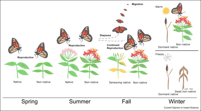xerces, monarchjointventure, nfwf.org, pnas.org, phys.org, palosverdespulse, nationalgeographic에 따르면, 캐나다 오타와대학교의 헤더 카루바(Heather Kharouba) 부교수 연구팀은 2023년 여름 오타와 플레처 야생동물 정원(Fletcher Wildlife Garden)에서 현장 실험을 실시했다. 식물만 0.6도 가온하고 나비는 자연 온도에 노출시킨 결과, 늦여름 꽃들이 당 함량이 낮은 꿀을 적게 생산하며 나비의 체중 증가가 현저히 둔화됐다.