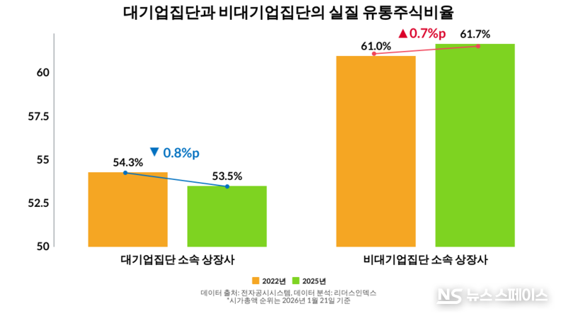 반면 비(非)대기업집단 상장사는 같은 기간 유통주식비율이 0.7%p 상승(61.0%→61.7%)하며 대조를 이뤘다. 시총을 주도하는 대기업 계열사들이 오히려 증시 유동성을 막는 역설적인 상황이다.