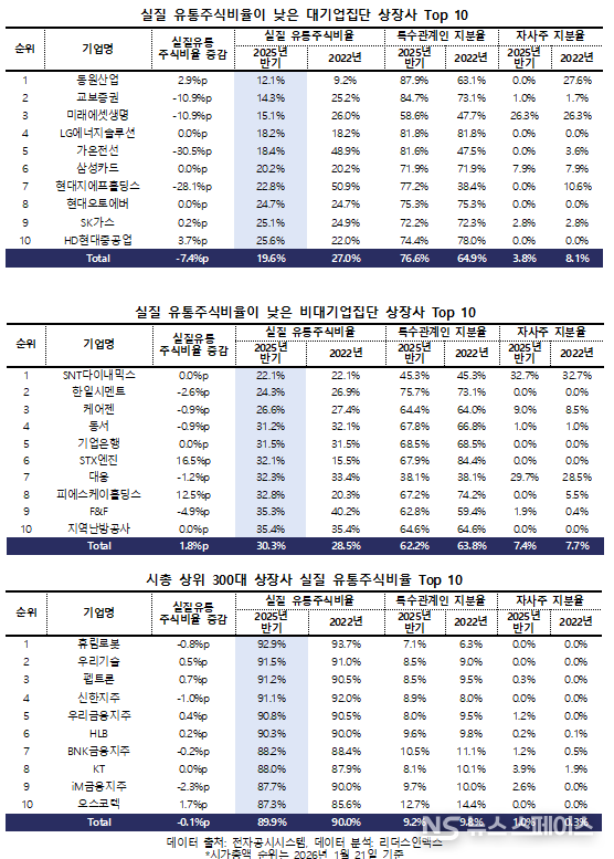 이번 조사는 ‘코리아 디스카운트’ 해소를 위해 상법 개정 논의가 본격화된 2022년부터 밸류업 정책과 제도 개선이 이어진 최근 3~4년을 분석 기간으로 삼았다. 실질 유통주식은 총 발행주식에서 자사주와 특수관계인 보유 주식을 제외해 산정했다.