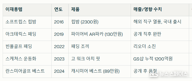 2022년 빈폴골프 패딩 조끼와 2024년 란스미어골프 캐시미어 베스트(89만원)는 리오더 물량까지 소진됐으며, 스케쳐스 '고 워크 아치 핏' 운동화는 GS샵에서 2017~2023년 누적 매출 1200억원을 돌파했다.