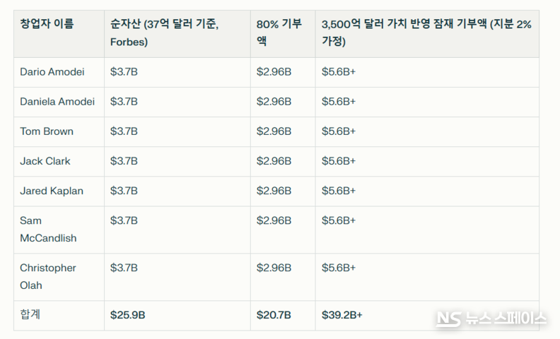 앤트로픽 공동창업자 7명—다리오 아모데이(CEO), 다니엘라 아모데이(사장), 톰 브라운, 잭 클라크, 재러드 카플란, 샘 맥캔들리시, 크리스토퍼 올라—의 순자산은 각 37억 달러로 집계되며, 총 259억 달러에 달한다.