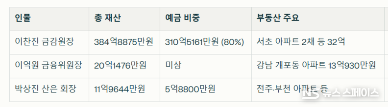 [뉴스스페이스=이은주 기자] 이찬진 금융감독원장의 총 재산 384억8875만원이 정부공직자윤리위원회(공직윤리위)의 2026년 1월 수시 재산공개에서 현직 공직자 2위로 확인됐다. 재산 대부분인 예금 310억5161만원이 신한은행에만 207억원을 포함해 16개 금융기관에 분산 보관됐으며, 이는 역대 금감원장 중 최대 규모다.