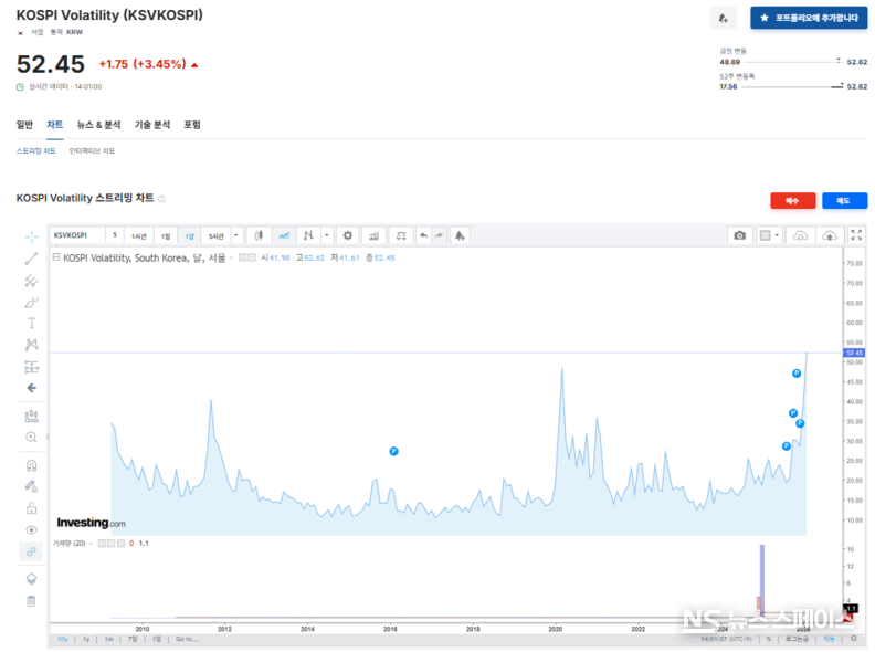 코스피 지수가 사상 최고치를 경신하는 가운데 한국형 공포지수로 불리는 코스피200 변동성지수(VKOSPI, KOSPI Volatility)가 장중 52.60까지 치솟으며 70개월 만에 최고치를 기록했다.