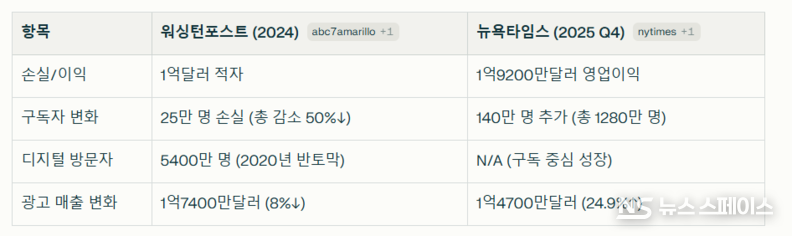 경쟁사 뉴욕타임스(NYT)는 2025년 디지털 구독자 140만명 추가로 총 1280만명을 돌파하며 총 매출 80억2300만달러(10.4% 증가), 영업이익 1억9200만달러를 달성했다. 2025년 4분기 디지털 구독 매출만 3억8100만달러(13.9%↑), 디지털 광고 1억4700만달러(24.9%↑)로 서비스·라이프스타일 콘텐츠 다각화가 주효했다.