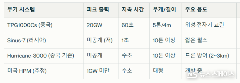 사우스차이나모닝포스트(scmp), newatlas, interestingengineering, ground.news에 따르면, 중국 서북핵기술연구소(NINT) 왕강(Wang Gang)이 이끄는 팀이 개발한 TPG1000Cs 고출력 마이크로파(HPM) 무기 드라이버는 길이 4m, 무게 5톤의 초소형 설계로 트럭·군함·항공기·위성 탑재가 가능하며, 세계 최초로 20기가와트(GW) 출력을 60초간 지속 발사할 수 있다.
