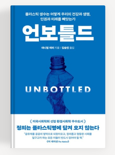 <언보틀드(대니얼 재피 지음 | 김승진 옮김 | 아를>에서 대니얼 재피 교수는 10년 넘게 들인 생생한 인류학 현장 연구서를 통해 "다국적 기업 4곳(네슬레·코카콜라·펩시·다논)이 병입생수 사업을 급격하게 확장하면서 어떤 일이 벌어졌는지, 사회·문화·환경적 영향을 다각도로 분석했다"며 "이들의 무문별한 확장이 공공 수돗물 시스템에 막대한 영향을 미쳤다"고 지적한다.