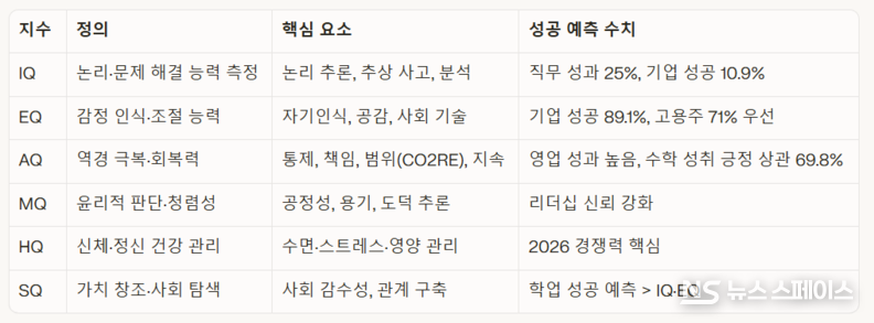 최근 연구들은 AQ(역경지수, Adversity Quotient)를 성공 공식의 핵심으로 부상시키며, 평생 성공을 IQ 20% + EQ·AQ 80%로 설명한다. 불확실한 2026년, MQ(도덕지수), HQ(건강지수), SQ(영성·사회지수)까지 포괄한 다차원 지능이 리더십과 지속 가능성을 결정짓는다는 분석이 나온다.