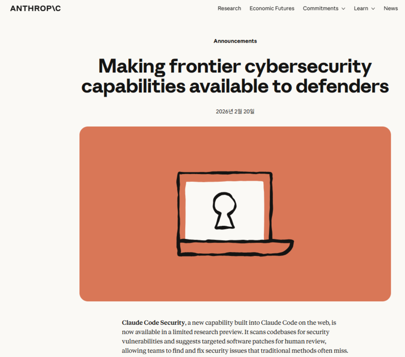 anthropic.com, thehackernews, timesofindia.indiatimes.com, fortune에 따르면, 앤트로픽은 2월 20일(현지시간) 소프트웨어 코드의 취약점을 자동으로 탐지하고 수정안을 제안하는 '클로드 코드 시큐리티'를 제한적 연구 프리뷰 형태로 공개했다. 이 기능은 클로드 코드 웹 버전에 통합돼 기업 및 팀 고객 대상으로 제공되며, 오픈소스 저장소 유지관리자에게는 무료 우선 접근을 지원한다.