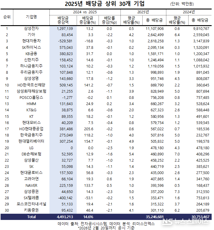 2월 24일 리더스인덱스(대표 박주근)가 국내 상장사 2651곳 가운데 2월 20일까지 현금 및 현물배당 공시를 완료하고 전년도와 비교 가능한 694개사의 2024·2025년도 배당 현황을 분석한 결과, 이들 기업의 전체 배당금은 41조6197억원에서 15.3%(6조3712억원) 증가한 47조9909억원으로 집계됐다.