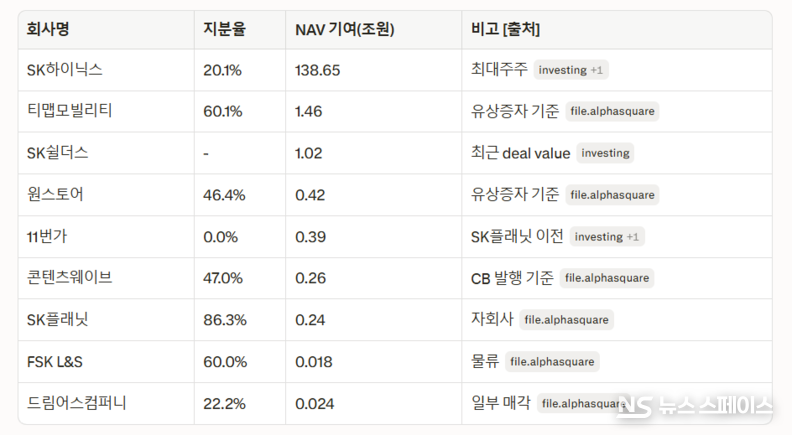 SK스퀘어는 순현금 1.09조원 포함 총 NAV 144.2조원 규모의 강력한 포트폴리오를 구축했다. 최근 인크로스·11번가 등 비핵심 자산 유동화로 반도체·AI 중심으로 재편 중이다. SK스퀘어의 NAV 대부분(138.65조원)이 SK하이닉스(지분율 20.1%로 최대주주)에서 나올 정도로 의존도 96%를 차지한다. 티맵모빌리티(60.1%, 1.46조원), 원스토어(46.4%, 0.42조원), SK플래닛(86.3%, 0.24조원) 등 ICT 자산도 보유한다.