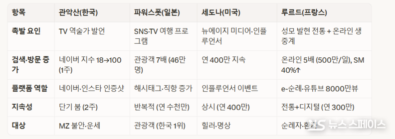 이 붐은 SNS 해시태그(#파워스폿)와 TV 여행 프로그램 노출 후 검색량 급증과 연동되며, 관악산의 네이버 지수 100 돌파 패턴과 유사하다. 일본 전국 파워스폿(약 100곳)은 연간 수천만 관광객을 유치하며, 미디어 한 방으로 단기 2~7배 방문객 증가를 반복하는 구조를 보인다.