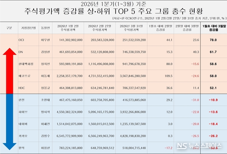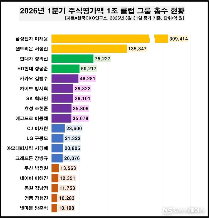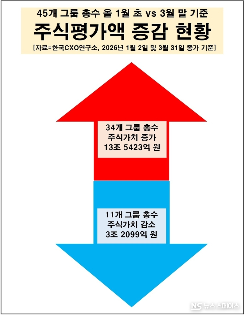 기업분석전문 한국CXO연구소는 4월 2일 ‘2026년 1월 초 대비 3월 말 기준 1분기 주요 그룹 총수 주식평가액 변동 조사’ 도출 결과를 발표했다. 조사 대상은 공정거래위원회(공정위)가 지난해 지정한 92개 대기업집단 중 올해(2026년) 3월 말 기준 주식평가액이 1000억원 넘는 그룹 총수(総帥) 45명이다.