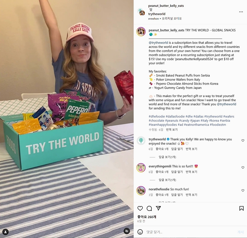 'Try the World' 구독 서비스는 매 월 8~9종의 세계 과자를 모아 정기배송 해주는 서비스다. 이번 공동 마케팅으로 ‘아몬드 빼빼로’가 포함됐다. 달콤한 초콜릿에 원물의 식감이 느껴지는 아몬드 분태로 현지 선호도가 높아 선정됐다. 아몬드 빼빼로는 5월 구독자 꾸러미에 구성되어 미국 각지의 과자 팬들에게 전달됐다.