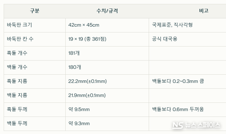 바둑판은 19x19, 총 361개의 교차점이 있다. 이는 1년 365일과 비슷해 인생의 축소판으로 비유되곤 한다. 바둑판에서 한 칸의 크기는 가로 2.25cm, 세로 2.34cm, 바둑알(흑돌·백돌의 갯수)는 흑돌 181개, 백돌 180개로 바둑판의 교차점 수와 동일한 총 361개이다.