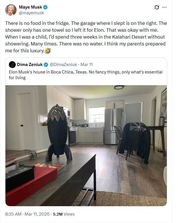 [뉴스스페이스=이승원 기자] 테슬라·스페이스X 관련 소식을 전해온 테크 블로거 디마 제뉴크가 텍사스 남부 보카치카(Starbase 인근)에 있는 머스크 집 내부 사진을 SNS에 올려 화제다. NDTV·힌두스탄타임스·뉴스위크·비즈니스인사이더 등 다수 매체가 ‘세계 최고 부자의 현실 거처’ '일론 머스크의 5만달러짜리 텍사스 집 내부'를 소개하며, 세계 1위 부자의 주거 공간이 얼마나 극단적으로 단출한지 상세히 전했다. 세계 1위 부자의 ‘빈 냉장고, 10평 집과 1장 수건'…머스크의 ‘자발적 미니멀리즘’ 실천 일론 머스크의 텍사스 보카치카 집 내부가 NDTV를 통해 공개된 지 일주일 만에, 그의 생활은 단순한 ‘소박함’이 아닌 철저한 ‘미니멀리즘 철학’으로 재조명되고 있다. 오픈형 거실·주방 구조, 흰색 수납장과 스테인리스 냉장고, 기본형 쿡탑 정도만 배치된 소규모 공간이다. 이번 화제를 결정적으로 키운 것은 머스크의 어머니 메이 머스크의 증언이다. 메이는 3월 10일(현지시간) X(옛 트위터)에 올라온 아들 집 사진에 직접 댓글을 달며 실제 생활 조건을 설명했다. 그가 X에서 “냉장고에는 음식이 하나도 없다(There is no food in the fr
