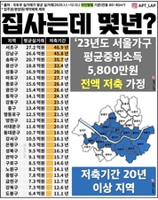 [뉴스스페이스=이은주 기자] 서울 시민이 묻는다. “집 사는 데 도대체 몇 년이 걸리나.” 서울 가구의 연간 중위소득 5800만원을 한 푼도 쓰지 않고 모은다는 비현실적인 가정 아래, 대다수 자치구에서 내 집 마련까지 최소 20년 이상이 걸린다는 분석이 나왔다. 서울 중위소득 5800만원, 집값은 10억·20억 시대 서울연구원이 실시한 ‘2024년 서울복지실태조사’에 따르면 2023년 기준 서울 가구의 중위소득은 연 5800만원, 평균 총소득은 6423만원으로 조사됐다. 상위 20% 가구의 평균 소득은 1억2481만원으로 하위 20%(2704만원)의 4.6배에 달해 소득 격차가 크게 벌어져 있다. 이 소득 수준을 전제로 서울 아파트 ‘국민평형’(전용 80~85㎡) 평균 실거래가를 적용하면, 서울 시민이 월세도, 생활비도 없이 모든 소득을 저축해 집을 사는 데 걸리는 기간은 평균 수십 년으로 계산된다. 실제로 부동산 정보업계에 따르면 2025년 1분기 기준 서울 전용 84㎡ 아파트 평균 매매가격은 약 14억6000만원으로 1년 새 25% 넘게 급등했다. 지도에 찍힌 ‘46.9년의 도시’ 서울 부동산 통계 계정 ‘APT_LAP’이 2025년 1월 1일