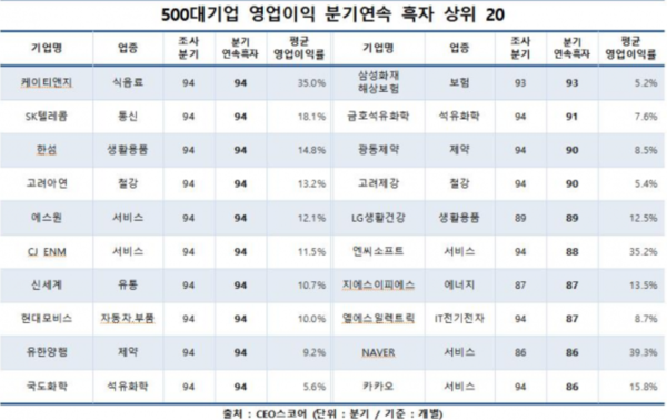 기업데이터연구소 CEO스코어는 국내 500대 기업 중 분기보고서를 제출한 352곳의 개별 재무제표 기준으로 실적을 조사한 결과 10개 기업이 94분기 연속 흑자를 기록했다고 밝혔다.
