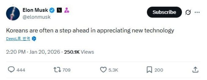 [뉴스스페이스=이종화 기자] 일론 머스크 테슬라 CEO가 2026년 1월 20일(현지시각) 자신의 X(구 트위터) 계정에 "한국인들은 새로운 기술을 받아들이는 데 종종 한발 앞서 있다"(Koreans are often a step ahead in appreciating new technology)고 게시하며 한국인을 얼리어답터로 평가했다.
