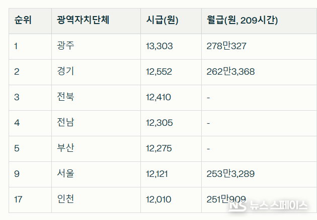 광주를 필두로 경기도(시급 1만2,552원, 월 262만3,368원), 전라북도(1만2,410원), 전라남도(1만2,305원), 부산광역시(1만2,275원)가 상위권을 형성했다. 서울특별시는 시급 1만2,121원(월 253만3,289원)으로 17개 광역자치단체 중 9위에 머물렀으며, 재정자립도와 주거비 부담이 높음에도 불구하고 중간 수준에 그쳤다.