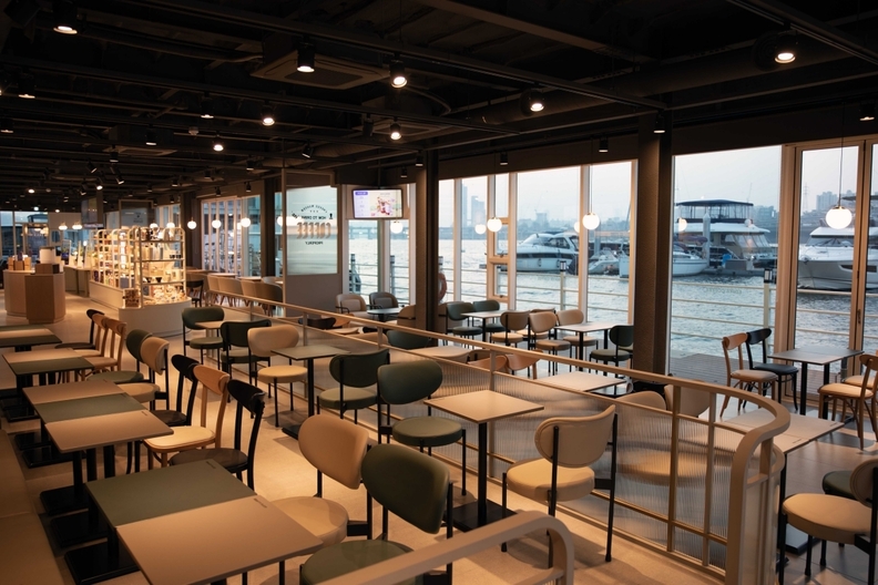 로얄마리나 한강점은 로얄마리나 1층에 위치한 약 140평 규모의 대형 매장이다. 화이트와 아이보리 톤을 중심으로 한 인테리어로 따뜻한 분위기를 연출했고, 전면 통창 설계를 적용해 선착장에 정박한 요트와 한강 풍경을 한눈에 담을 수 있도록 했다. 도심 속에서도 여행지 같은 개방감을 느낄 수 있도록 ‘리버사이드 카페’ 콘셉트를 강화한 점이 특징이다.