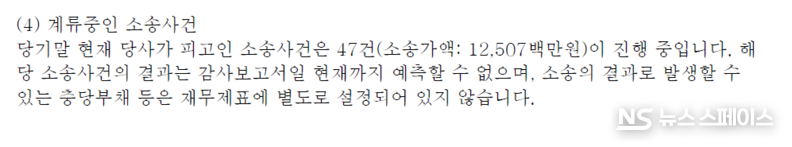 회사가 피고인 소송사건은 당기말 기준으로 무려 47건이며, 소송가액 합계는 125억 700만원에 이른다. 감사보고서는 "소송의 결과로 발생할 수 있는 충당부채는 재무제표에 별도로 설정되어 있지 않다"고 명시해, 잠재적 패소에 따른 현금 유출 리스크가 추가로 존재한다.