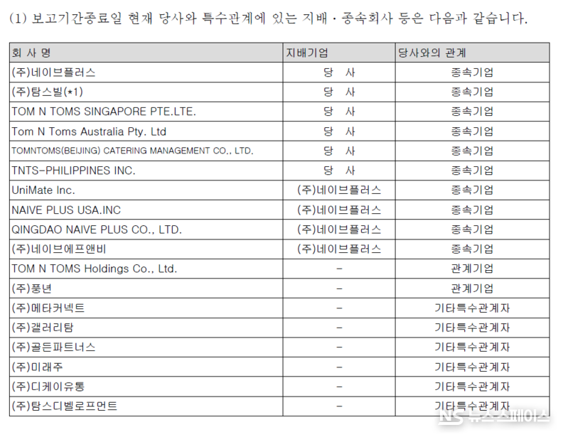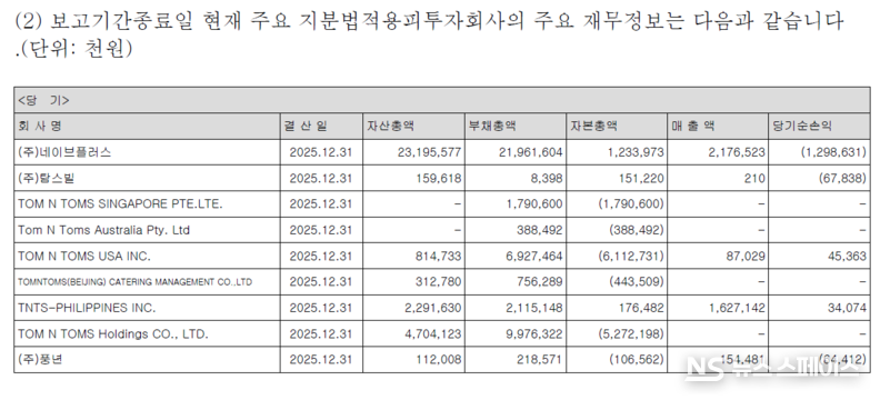 TOM N TOMS SINGAPORE PTE.LTE.는 부채만 17억 9,060만원이고 자산은 제로(0)다. TOM N TOMS USA INC.는 자산 8억 1,473만원에 부채가 69억 2,746만원으로 자본이 -61억 1,273만원에 이른다. TOM N TOMS Holdings CO., LTD.도 자산 47억 413만원 대 부채 99억 7,632만원으로 자본이 -52억 7,220만원이다. 호주 법인(Tom N Toms Australia Pty. Ltd.) 역시 자산 제로에 부채가 3억 8,849만원으로 완전자본잠식 상태다.