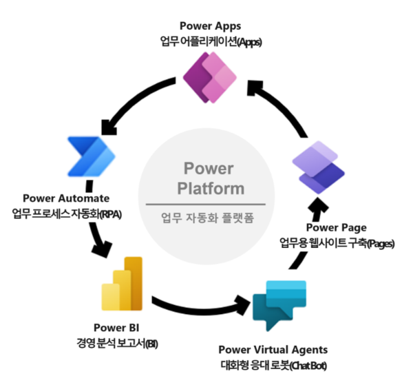 Microsoft 365 Cloud 기반의 업무자동화 플랫폼으로 Power Apps, Automate, Virtual Agents, BI, Power Page으로 구성되어 있으며, 현업 일반 사용자가 직접 업무에 필요한 웹(Web), 앱(App), 자동화(RPA), 보고서(BI), 챗봇(Chat Bot)을 개발 할 수 있다.