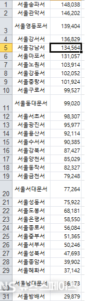 관악경찰서(14만6202건), 영등포경찰서(13만9404건), 강서경찰서(13만6829건), 강남경찰서(13만4564건)가 TOP5로 파악됐다.